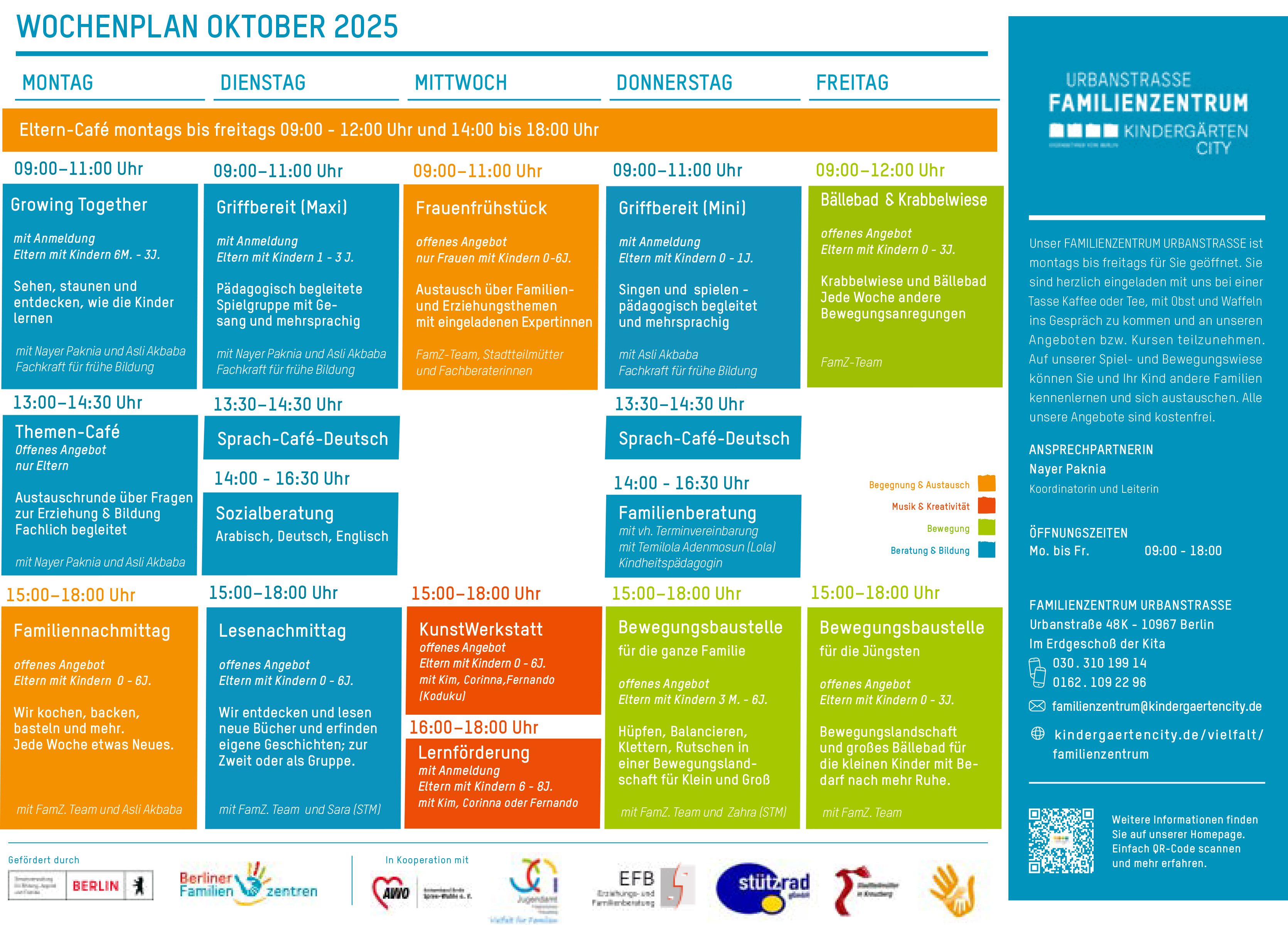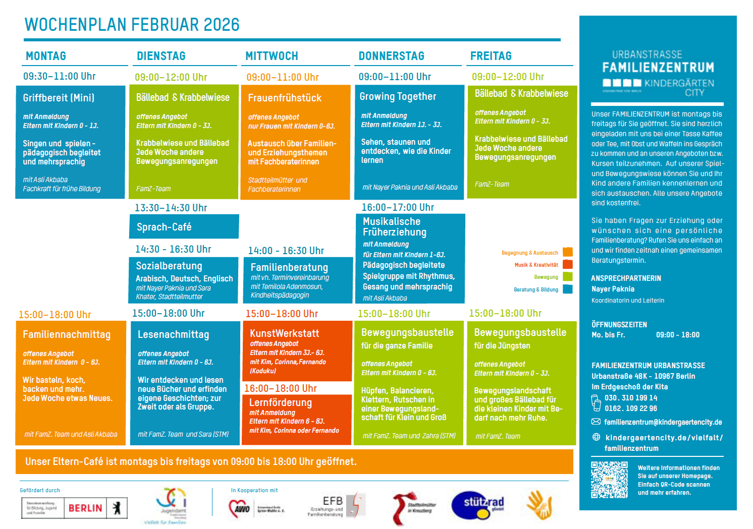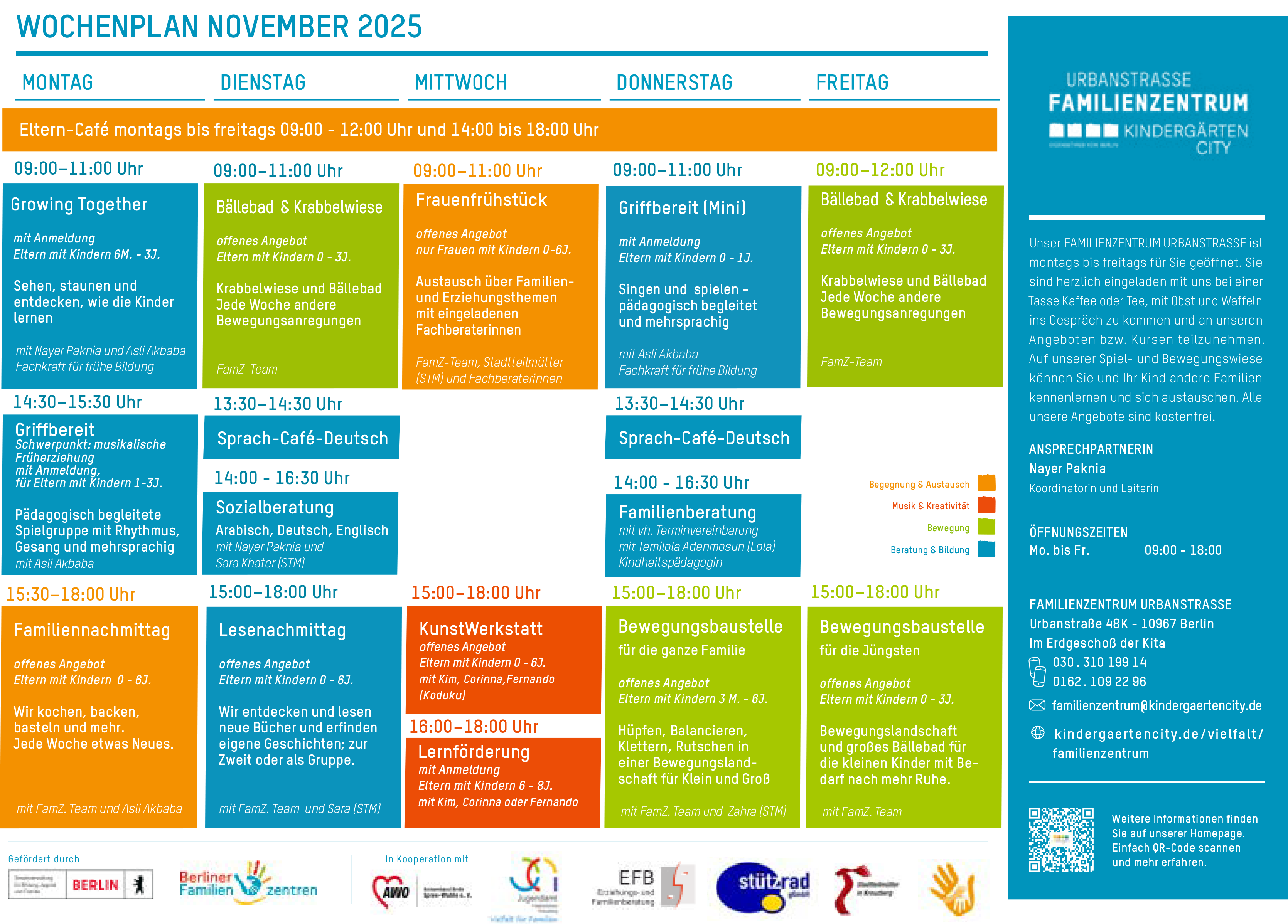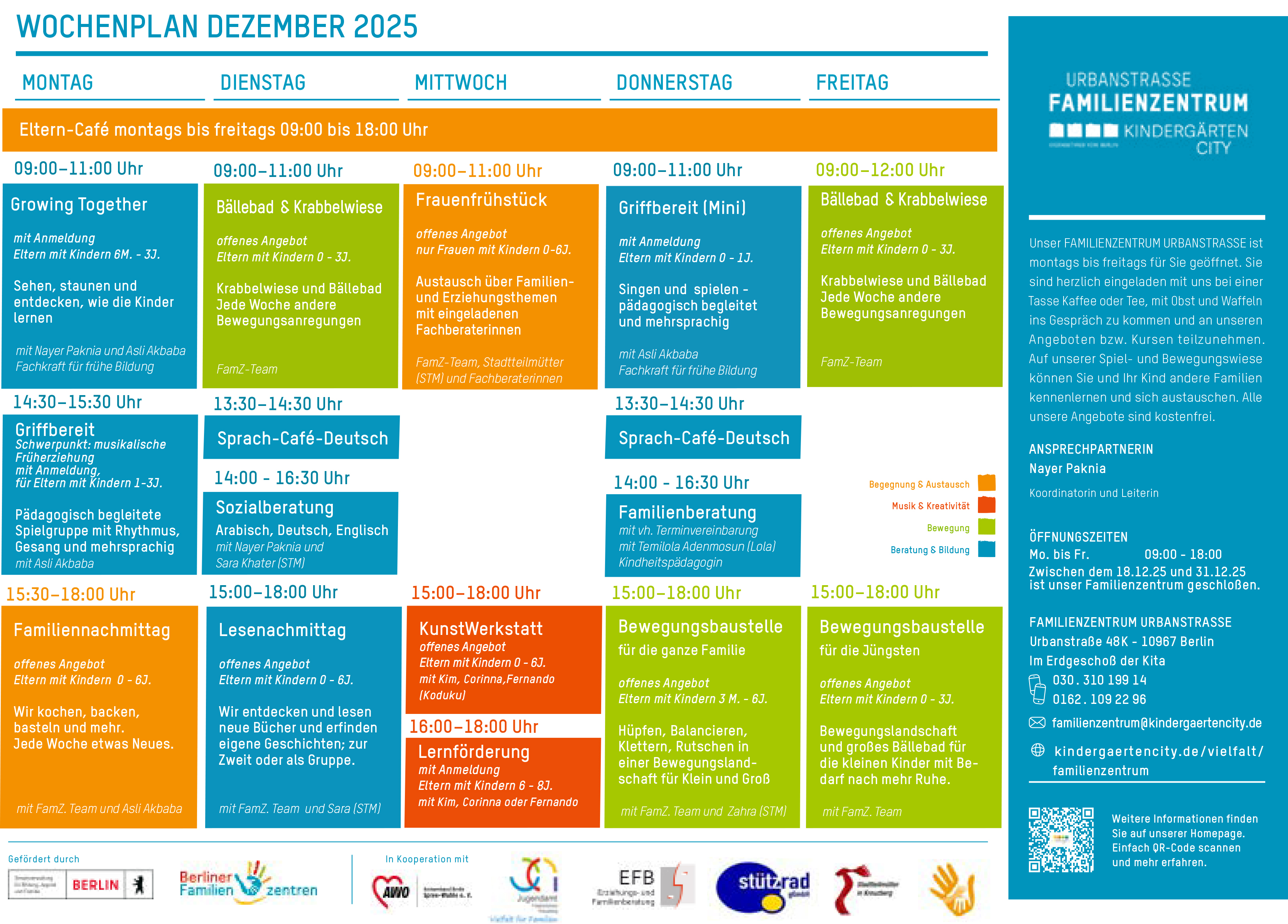 Das Projekt wurde 2021 durch die Kita Urbanstraße 48K von Kindergärten City initiiert und mit finanzieller Unterstützung des Landes Berlin realisiert. Das Land fördert die sozialräumlich ausgerichtete Entwicklung von Familienzentren, um die Infrastruktur für Familien zu verbessern. Weitere Informationen finden Sie unter berliner-familienzentren.de.