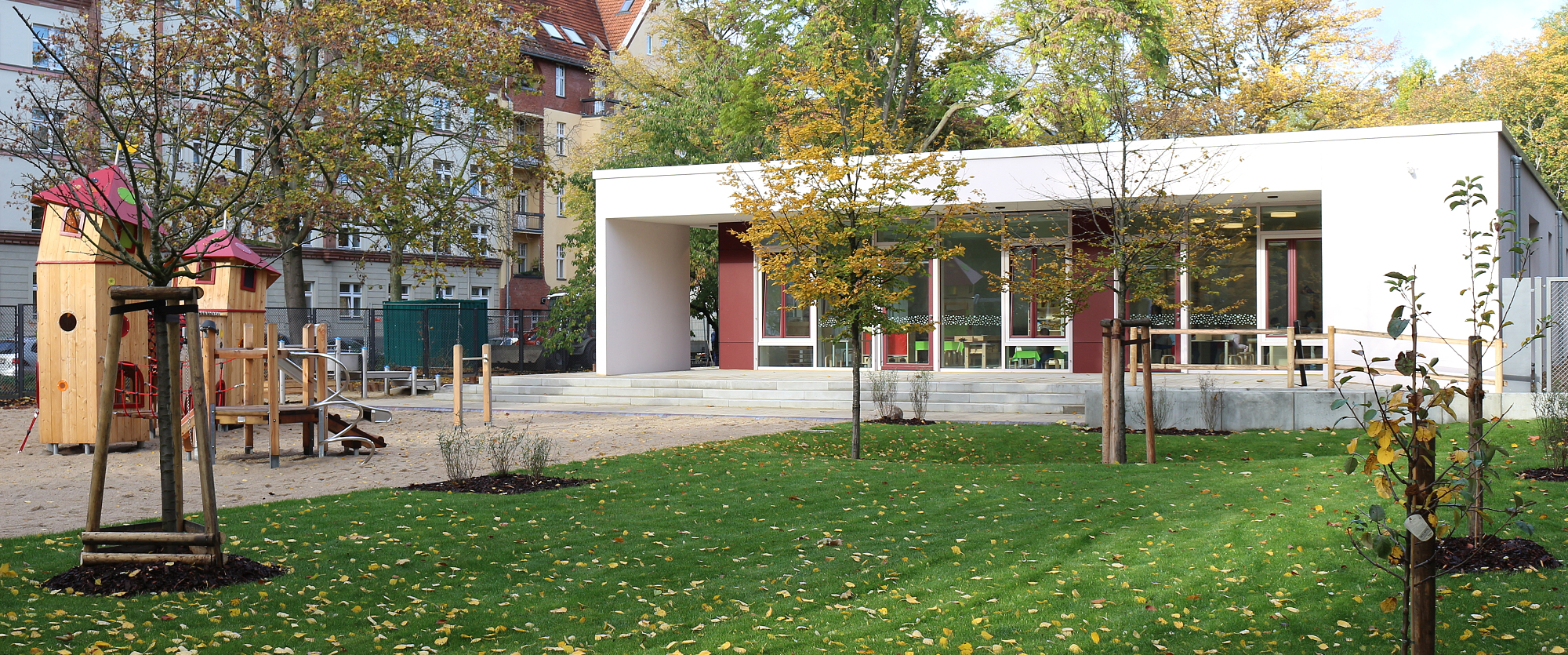 Unsere moderne und einladende Kita liegt mitten im grünen Schillerpark und hat ein sehr schönes und großes eigenes Außengelände zu bieten. Wir sind mit den Kindern täglich an der frischen Luft. Sie haben viel Platz zum Spielen, Bauen und ausgiebiger Bewegung und erleben dabei, wie sich die Natur im Laufe des Jahres verändert. Unser pädagogisches Konzept ist die Offene Arbeit, die Kinder können sich in der Kita frei bewegen und die Angebote nutzen, die sie interessieren.