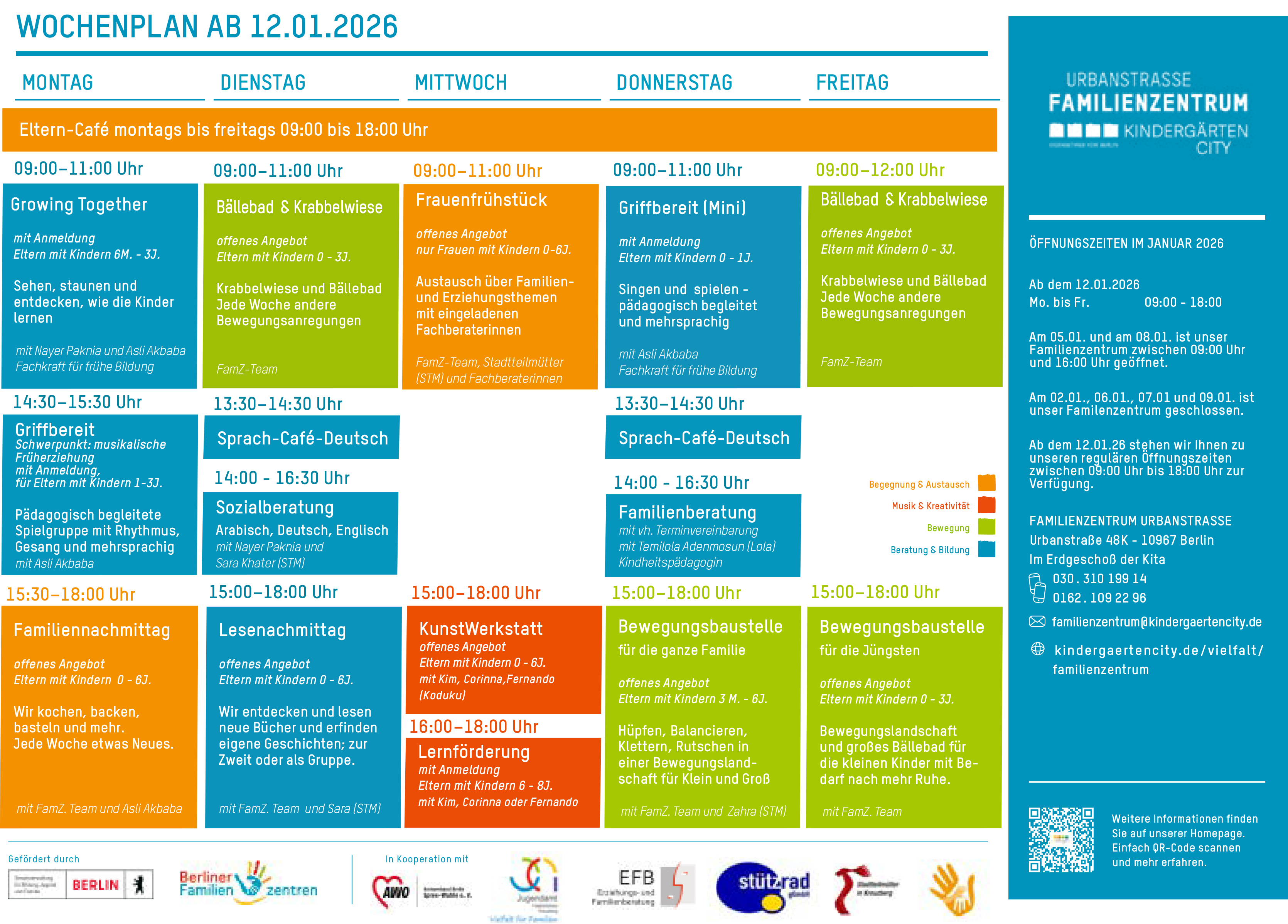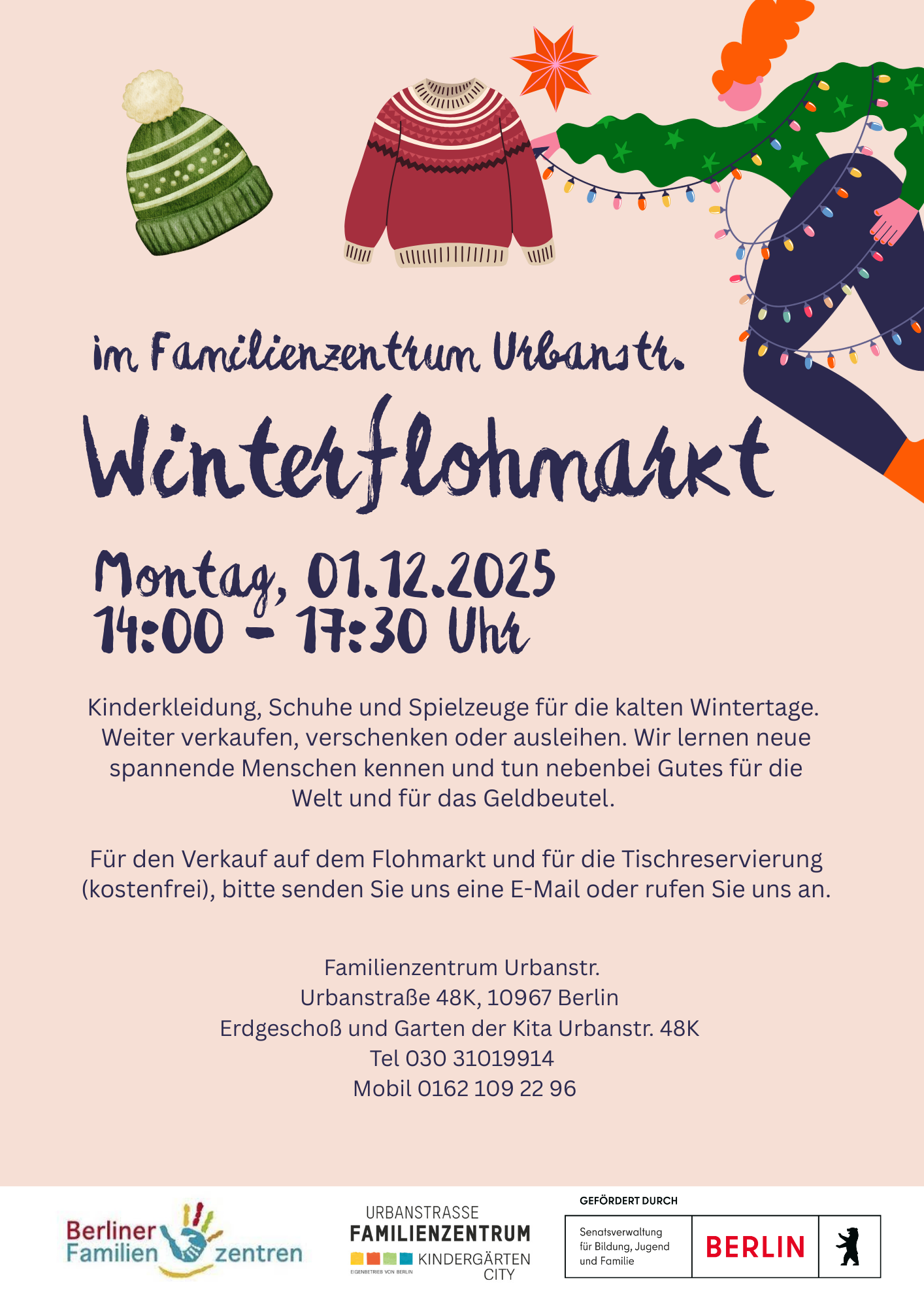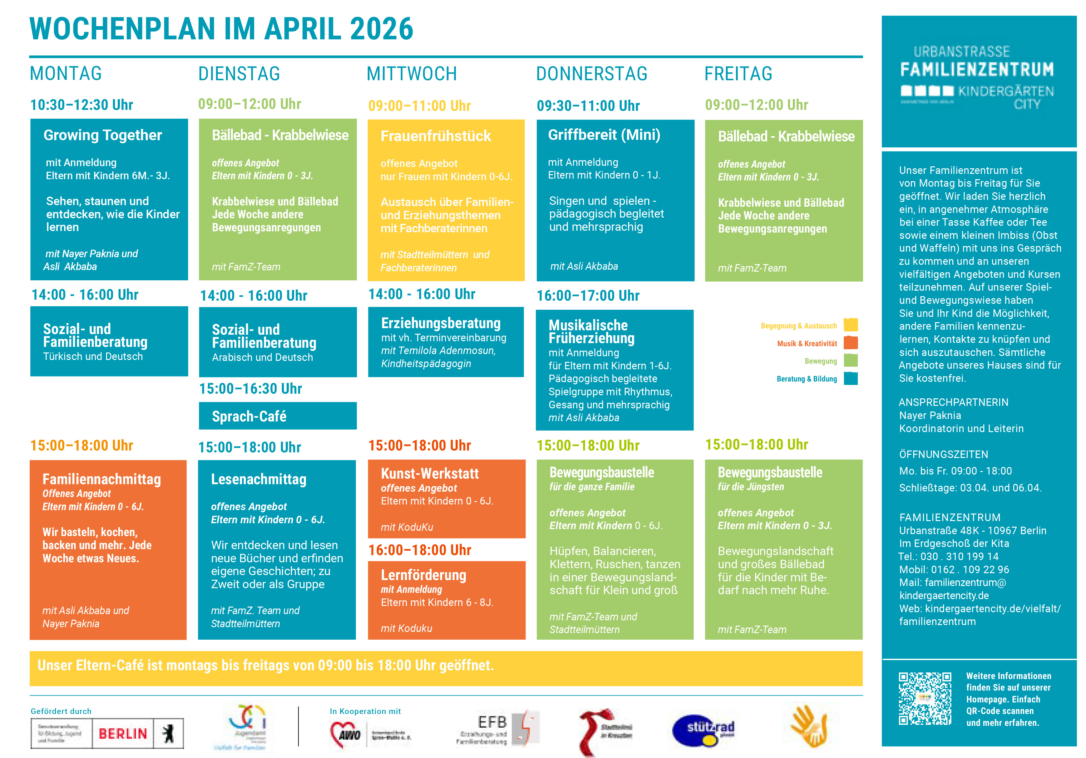 Das Projekt wurde 2021 durch die Kita Urbanstraße 48K von Kindergärten City initiiert und mit finanzieller Unterstützung des Landes Berlin realisiert. Das Land fördert die sozialräumlich ausgerichtete Entwicklung von Familienzentren, um die Infrastruktur für Familien zu verbessern. Weitere Informationen finden Sie unter berliner-familienzentren.de.